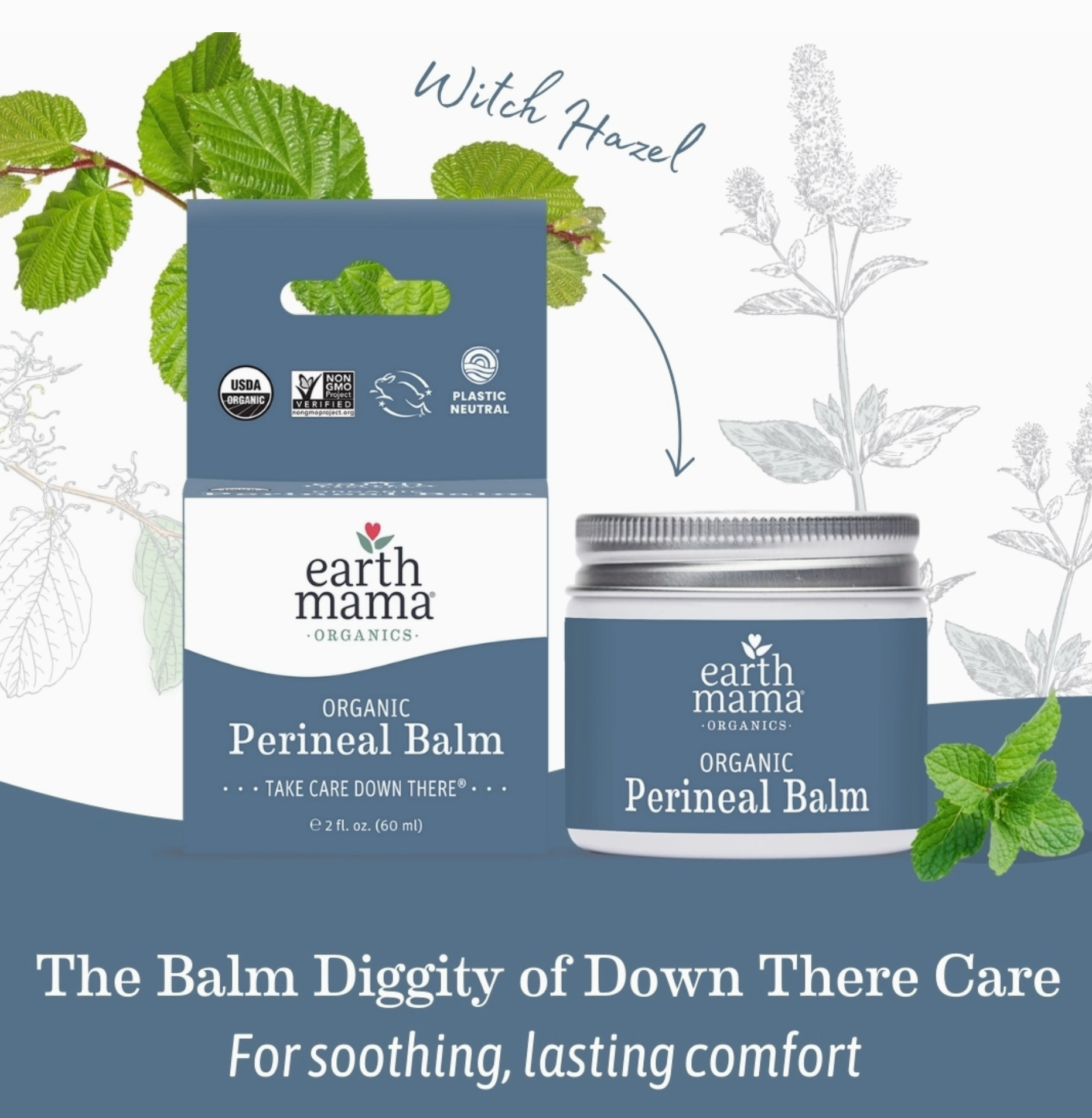 Organic Perineal Balm helps provide lasting, cooling comfort for pregnancy and postpartum “down there” nether region. The cruelty-free balm boasts an exclusive herbal blend of organic witch hazel and other rich organic botanicals — all traditionally used