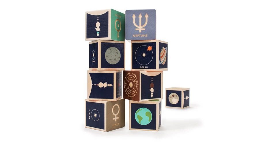 Mercury. Venus. Earth. Mars. Jupiter. Saturn. Uranus. Two debossed sides feature the planet’s symbol, name, and number of moons. The four printed sides reveal a planet illustration, diameter, location, and distance from the sun. This 9 block set honors all 8 planets in our solar system; plus a bonus dwarf planet, Pluto.